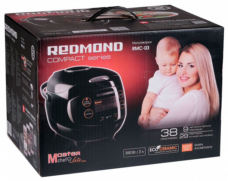 Прибор попадает к потребителю в картонной коробке-параллелепипеде, оформленной в фирменном стиле Redmond с обилием фотографий и разноплановой информации. На фронтальных сторонах можно ознакомиться с внешним видом самой мультиварки и перечнем ее достоинств. На одной боковой стороне приведены технические характеристики прибора, на другой — фотографии блюд, которые можно приготовить с помощью прибора. На крышке упаковки можно увидеть сообщение о том, что выпущено мобильное приложение «Готовим с Redmond». Коробка оснащена ручкой для переноски.