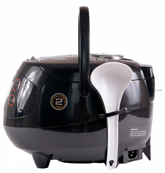 Корпус обтекаемой формы полностью изготовлен из пластика. Материал хорошо обработан и не выглядит дешево. Прибор снабжен ручкой для переноски. С правого бока на корпусе имеется держатель для ложки или черпака.