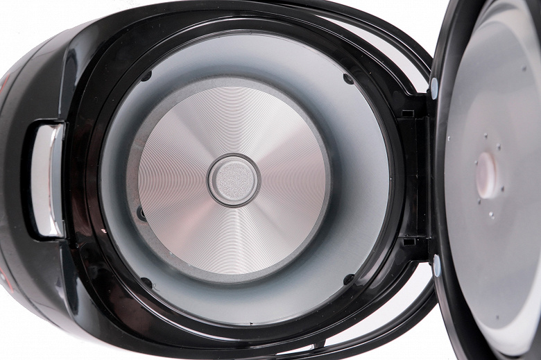 Теперь откроем крышку прибора. С обратной ее стороны закреплена съемная внутренняя крышка, а по периметру идет уплотнительное силиконовое кольцо — стандартная ситуация. Наличие внутренней крышки при несъемной большой крышке сложно переоценить. Прежде всего, она защищает внутреннюю часть несъемной крышки от загрязнений, благодаря чему уход за прибором становится проще.